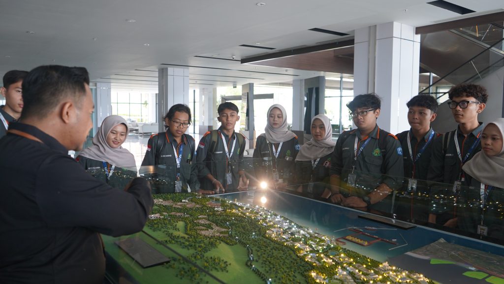 Setelah sesi materi, mahasiswa diajak melakukan tur singkat untuk melihat miniatur masterplan kawasan industri. Pada bagian ini, peserta mendapatkan penjelasan langsung mengenai tata ruang, zona industri, fasilitas strategis, hingga rencana pengembangan kawasan berbasis teknologi. Sesi ini membuat mahasiswa dapat melihat secara visual bagaimana pengelolaan kawasan industri dilakukan secara terstruktur dan modern.